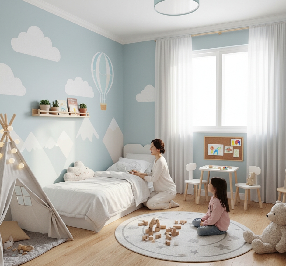 - 아이의 의견 반영: 아이가 좋아하는 색상을 반영하되, 너무 채도가 높은 원색보다는 파스텔 톤이나 은은한 색감을 선택하는 것이 시각적 피로를 줄여줍니다.